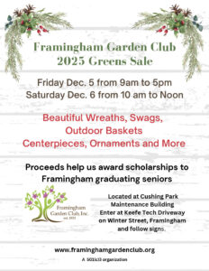 Framingham Garden Club’s 2025 Holiday Greens Sale is around the corner! This eagerly awaited fundraiser sale will be open from 9am to 6pm on Friday, Dec. 5 and from 10am to 12pm on Saturday, Dec. 6.