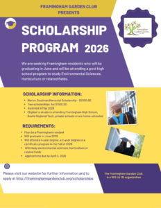 The Framingham Garden Club, Inc. is pleased to offer scholarships to graduating seniors who will be attending a post high school program that includes either a four-year degree, a two-year degree or a certificate program. One $2000 scholarship (The Marian Goodman Scholarship) and two $1500 scholarships will be awarded in May 2026.